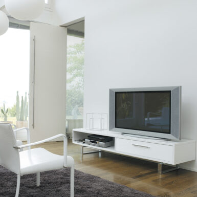 Linee minimali e senza tempo anche per i nostri mobili porta Tv, liberi di uscire dagli schemi dell’arredo più tradizionale. Qui la parola d’ordine è immaterialità: il peso visuale dello schermo è bilanciato da volumi minimi che non inducono in distrazioni.