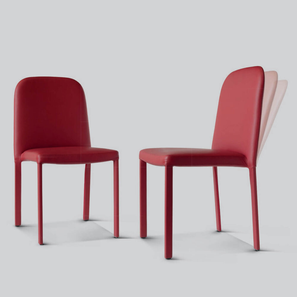 Sedia impilabile, struttura in acciaio, schienale flessibile in acciaio armonico, rivestita in pelle, tessuto o ecopelle. Gambe completamente rivestite.
