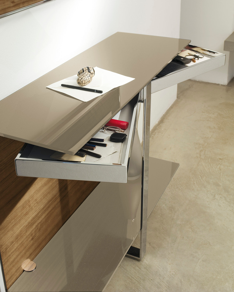 Consolle, struttura in cromo lucido o verniciata, pannello in legno o legno laccato o ceramicato, piani in cristallo temperato o verniciati, cassetti in acciaio o metallo verniciato.